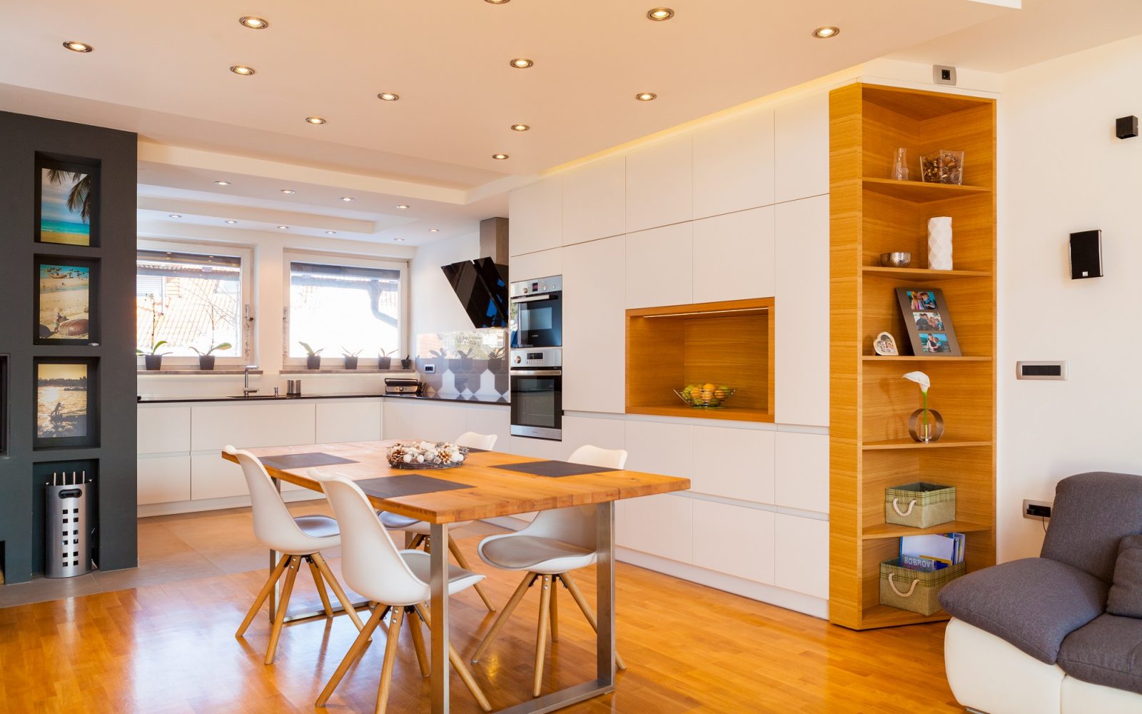 Kuhinja mora imeti okna in dovolj svetlobe. Pika. Naravna svetloba pa kuhinji ne izboljša le estetski videz, temveč je nujna tudi zaradi varnosti in praktičnosti. Kuhinjo lahko opremimo z več viri svetlobe – ambientalno svetlobo, močnejšo svetlobo nad delovno površino ali z njo le pritegnemo pogled na mizo ali lepo oblikovano vitrino.