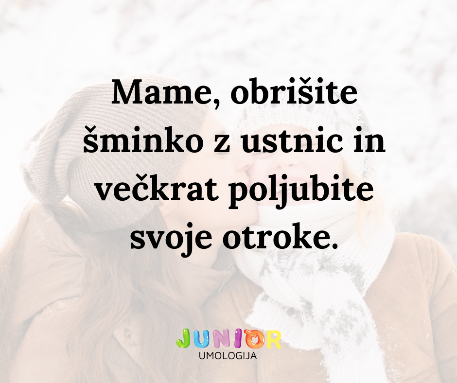 Veste, kaj lahko tudi vidimo? Vidimo dolge nohte, ki morajo paziti, da ne opraskajo svojega otroka. Vidimo dolge trepalnice, ki blago zastirajo jasen pogled in sproščeno mimiko našega očesa. Vidimo ličila na obrazu, ki onemogočajo ličkanje in pihanje balončkov v mehko kožo vašega malčka. Vidimo našminkane ustnice, ki ne morejo v vsakem trenutku dati slastnega maminega poljubčka. Vidimo brezhibno urejeno pričesko, ki bo pritegnila večino vaše pozornosti, ko boste imeli otroka v svojem naročju in bo grabil po vaših lepih laseh. In močni vonji? Previdno tudi s tem. Kup parfumov, dišav, kadil, mehčalcev ipd. zmoti že nas, odrasle. Kaj šele naše malčke.