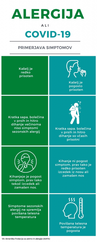 “Za alergijski rinitis je značilno več vodnega izcedka iz nosu, pridruženo vnetje oči, kihanje. Pacienti s potrjeno boleznijo covid-19 imajo pa pogosteje popolno izgubo voha, splošno oslabelost, splošno slabo počutje, kašelj, bolečine v mišicah,” primerja sogovornik.