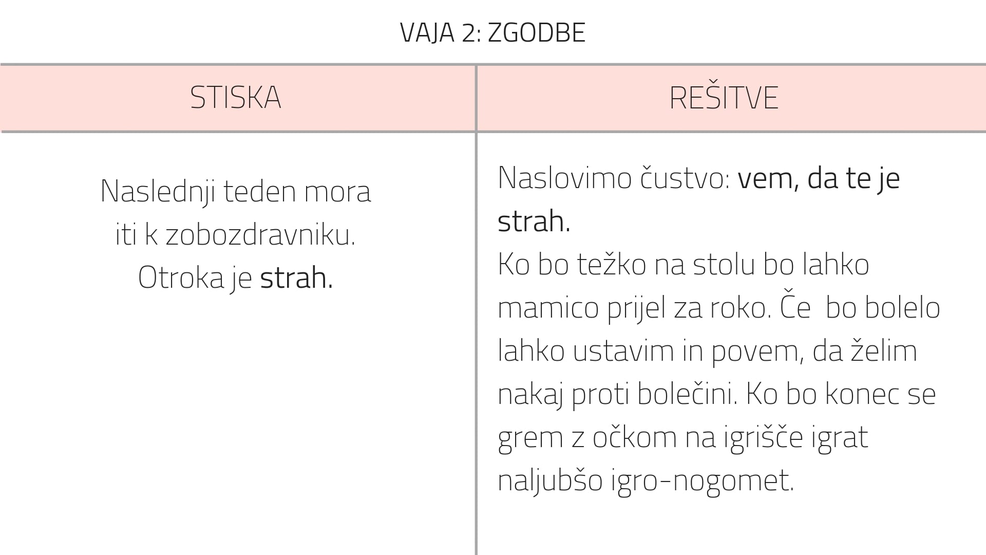 V naslednji vaji najdite različne primere, ki vašemu otroku lahko predstavljajo stisko. Nato pa ob teh stiskah napišite, kaj bi vašega otroka lahko pomirilo (še boljše je, če te strategije izoblikujete skupaj z vašim otrokom).