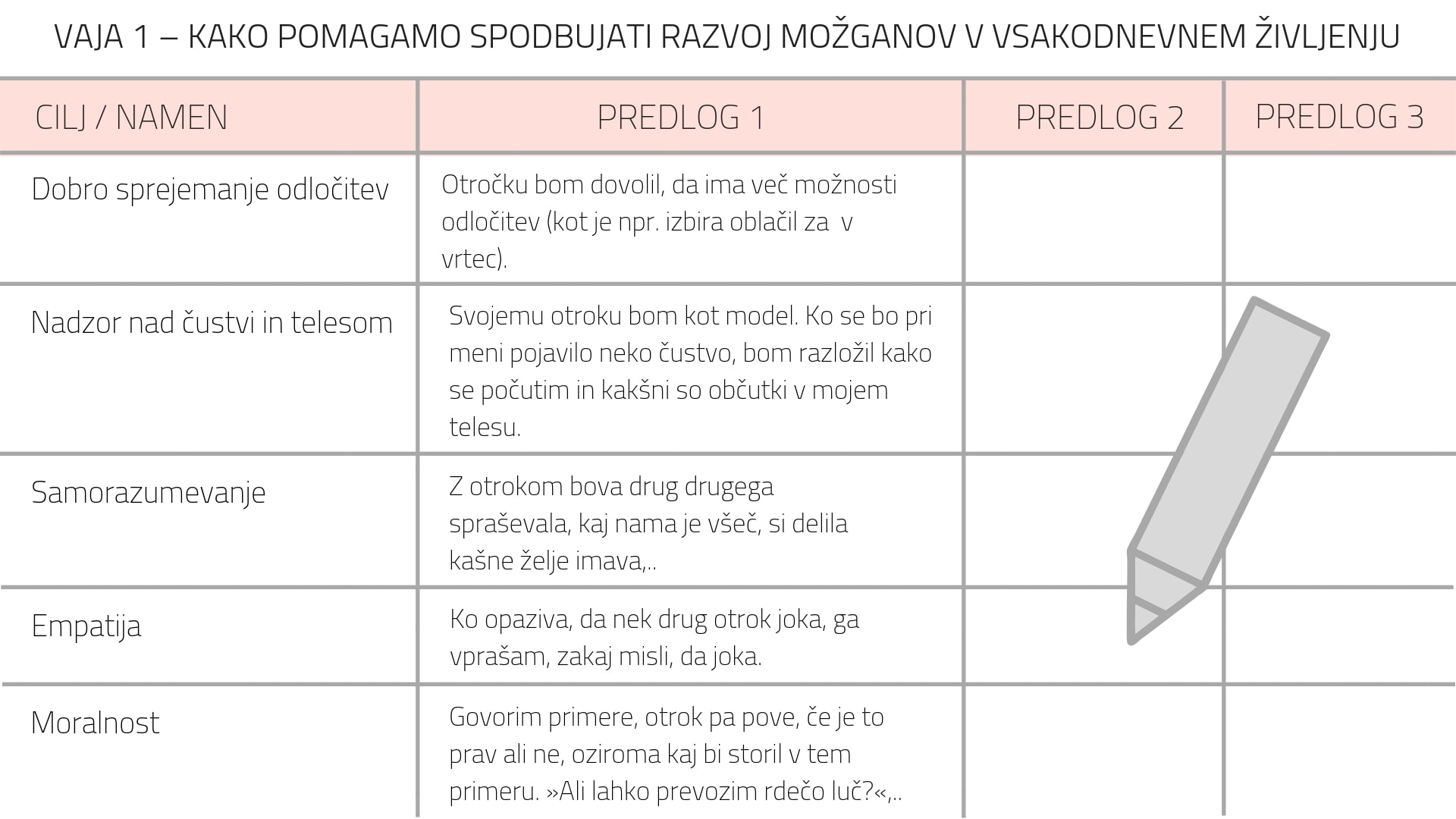 Naša pomembna naloga je tudi, da spodbujamo razvoj možganov v vsakodnevnem življenju. Razmislite, kako bi lahko pomagali svojemu otroku. K vsakemu cilju napišite eden ali dva predloga, ki bi ga pomagala doseči.
