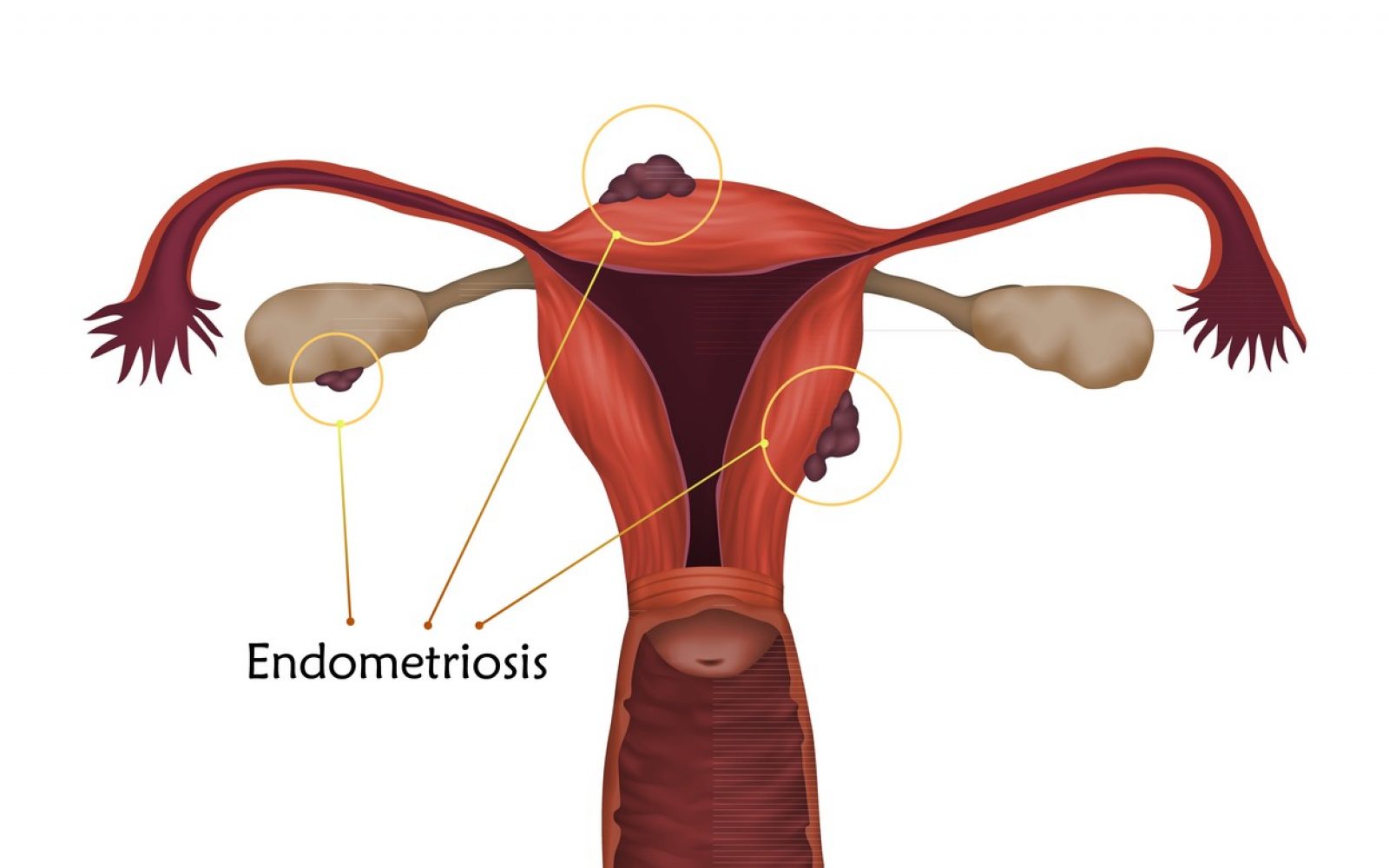 Kronične bolečine v spodnjem delu telesa in boleče menstruacije, krvavitve iz črevesja ali krvav urin ob menstruaciji, boleči spolni odnosi, črevesni krči pri odvajanju blata, neplodnost.