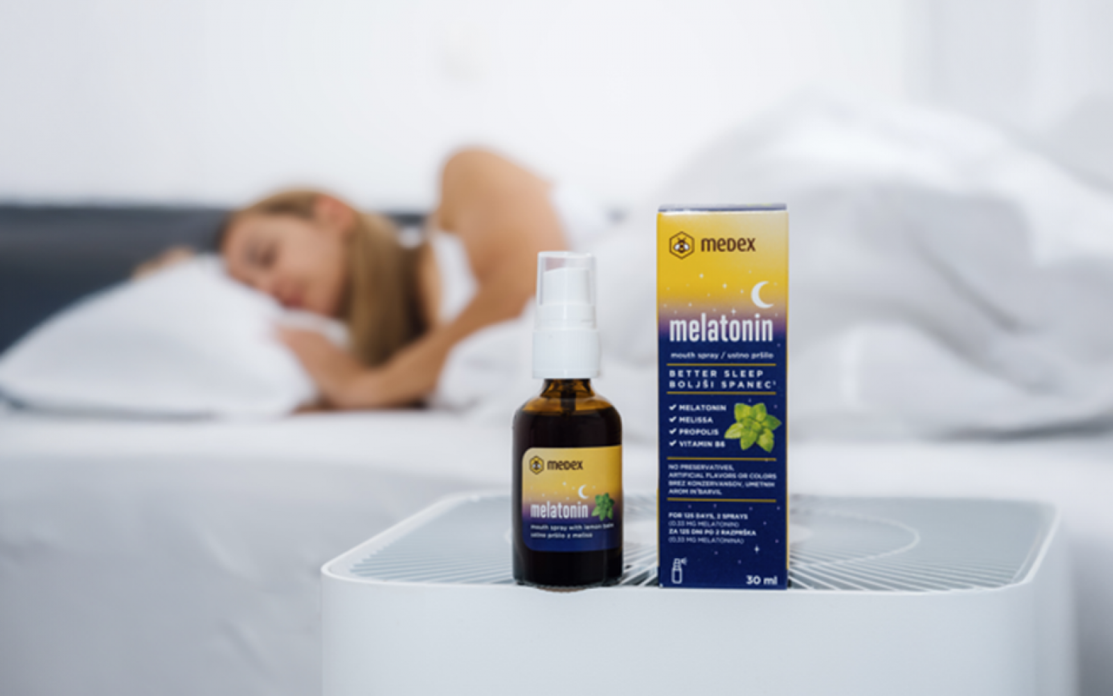 Novo pršilo Melatonin je na voljo na policah izbranih lekarn, specializiranih prodajalen in na spletni strani www.medex.si/melatonin.