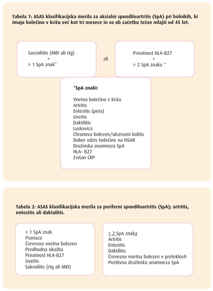 Ker se znaki pojavijo veliko prej, preden je lahko postavljena dokončna diagnoza, naša sogovornica pravi, da je prav zato pred kratkim mednarodna skupina strokovnjakov (ASAS) uvedla nova klasifikacijska merila za diagnosticiranje spondiloartritisov, ki naj bi bila osebnemu zdravniku v pomoč pri odločanju za napotitev k specialistu revmatologu. Znotraj teh meril so spondiloartritise razdelili v dve skupini. »Glede na mesto vnetnega procesa spondiloartritise delimo na aksialne s poglavitno aksialno prizadetostjo (z vnetjem sklepov in zmanjšano gibljivostjo hrbtenice) ter na periferne spondiloartritise, kjer je periferna prizadetost sklepov pretežno na spodnjih okončinah: periferni artritis, entezitis (vnetje narastišča tetiv na kosti) in daktilitis (v celoti vnet prst, ki je posledica bodisi vnetja vseh sklepov na prstu ali vnetja tetive).« Za vse podskupine spondiloartritisov je značilna družinska obremenjenost in povezanost z nosilstvom antigena iz sistema levkocitnih antigenov človeka HLA-B27.