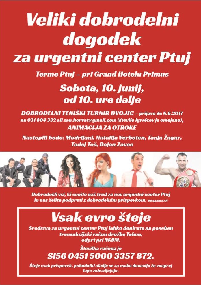 Naslednja priložnost, da vsi skupaj pokažemo svojo solidarnost, bo 10. junija po 10. uri. Pri Grand Hotelu Primus v Termah Ptuj poteka osrednji dobrodelni dogodek z nastopom številnih znanih glasbenih izvajalcev, teniškim turnirjem dvojic, poskrbljeno bo za animacijo najmlajših ter druženje z ambasadorjema, Dejanom Zavcem in Tadejem Tošem. Znova bomo izpostavili problematiko urgentnega centra. Zbiranje sredstev bo potekalo tudi na prireditvi, zato vabljeni vsi, ki želite podpreti akcijo. Zbiranje sredstev poteka tudi po osrednjem dobrodelnem športno-družabnem dogodku.