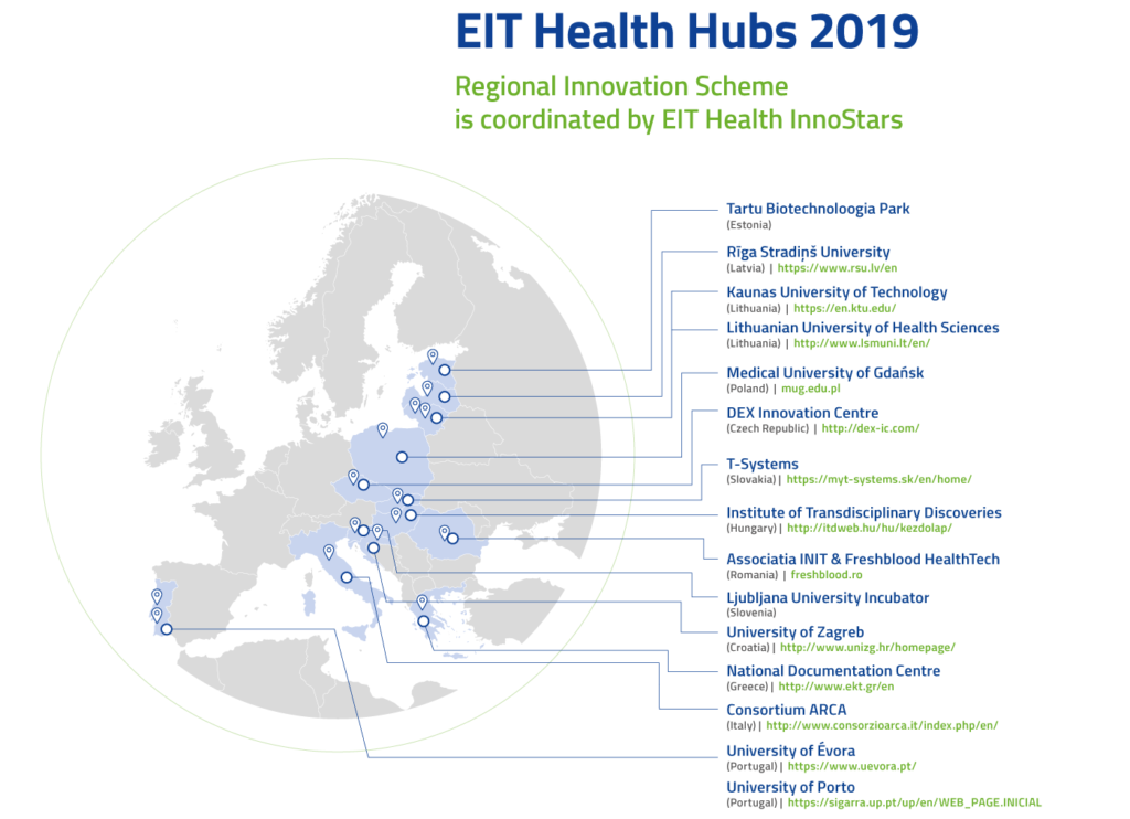 Nove tehnologije bi tako morda zlahka spregledali, če ne bi bilo tega programa, ustvarjenega za povezovanje zahodnih in vzhodnih regij. Regionalna shema inovacij mreže EIT Health pomaga pri prepoznavanju, inkubiranju, potrjevanju in širitvi idej iz 13 držav: Portugalske, Italije, Grčije, Madžarske, Poljske, Slovaške, Češke, Romunije, Hrvaške, Slovenije, Estonije, Latvije in Litve. Program vključuje 14 vozlišč, ki se nahajajo v 13 državah po vzhodni, srednji in južni Evropi. Ta vozlišča so dostopne točke do vseevropske mreže najboljših univerz, podjetij in njihovih projektov. Cilj programa je pomagati dozoreti regijam, v katerih deluje, odkriti njihove edinstvene inovacijske prednosti in nagovoriti lokalne inovatorje k sodelovanju v vseevropskih programih in tekmovanjih. Program vodi Evropski inštitut za inovacije in tehnologijo (EIT), na področju zdravstva pa ga usklajuje EIT Health InnoStars.