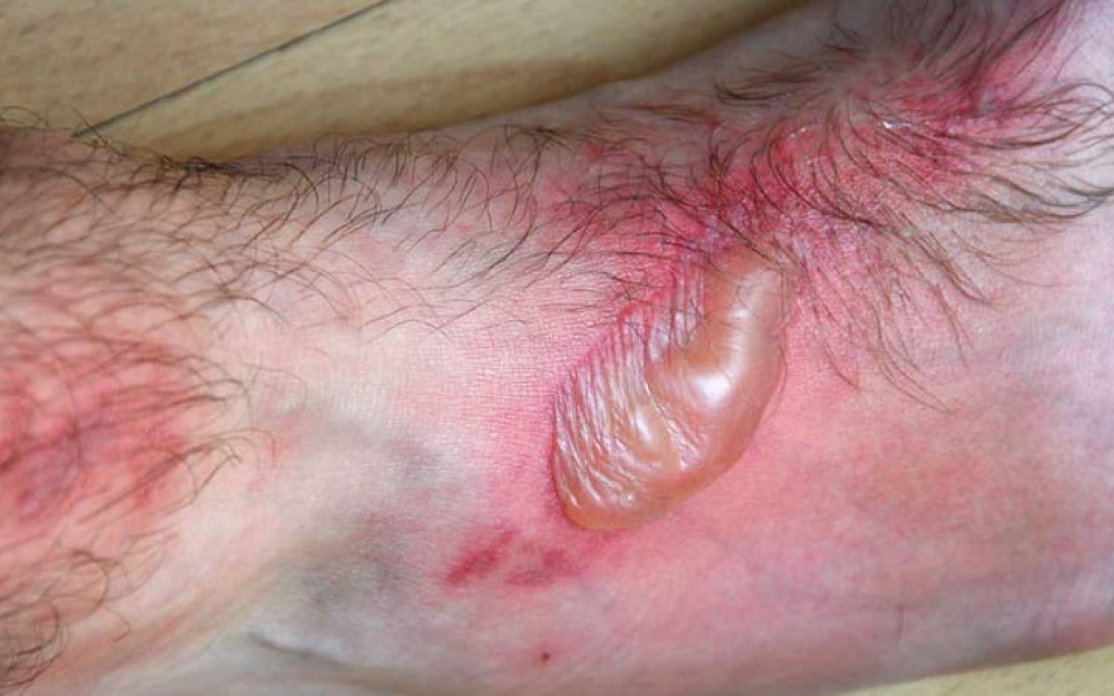 ostro omejena pordela in otekla področja z mehurčki ali večjimi mehurji.