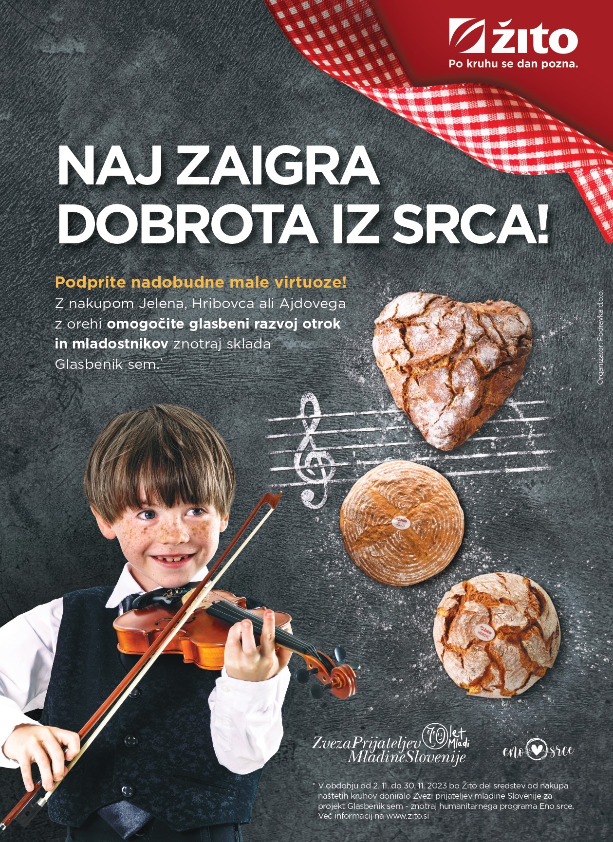 Del sredstev od nakupa Jelena, Hribovca ali Ajdovega kruha z orehi bo Skupina Žito donirala ZPMS za projekt Glasbenik sem – znotraj programa Eno srce. Poteza je čudovita v obe smeri – z nakupom okusnega in kakovostnega kruha na drugi strani prispevamo k razvoju mladih glasbenih talentov po Sloveniji in pomagamo mladim uresničevati njihove sanje.