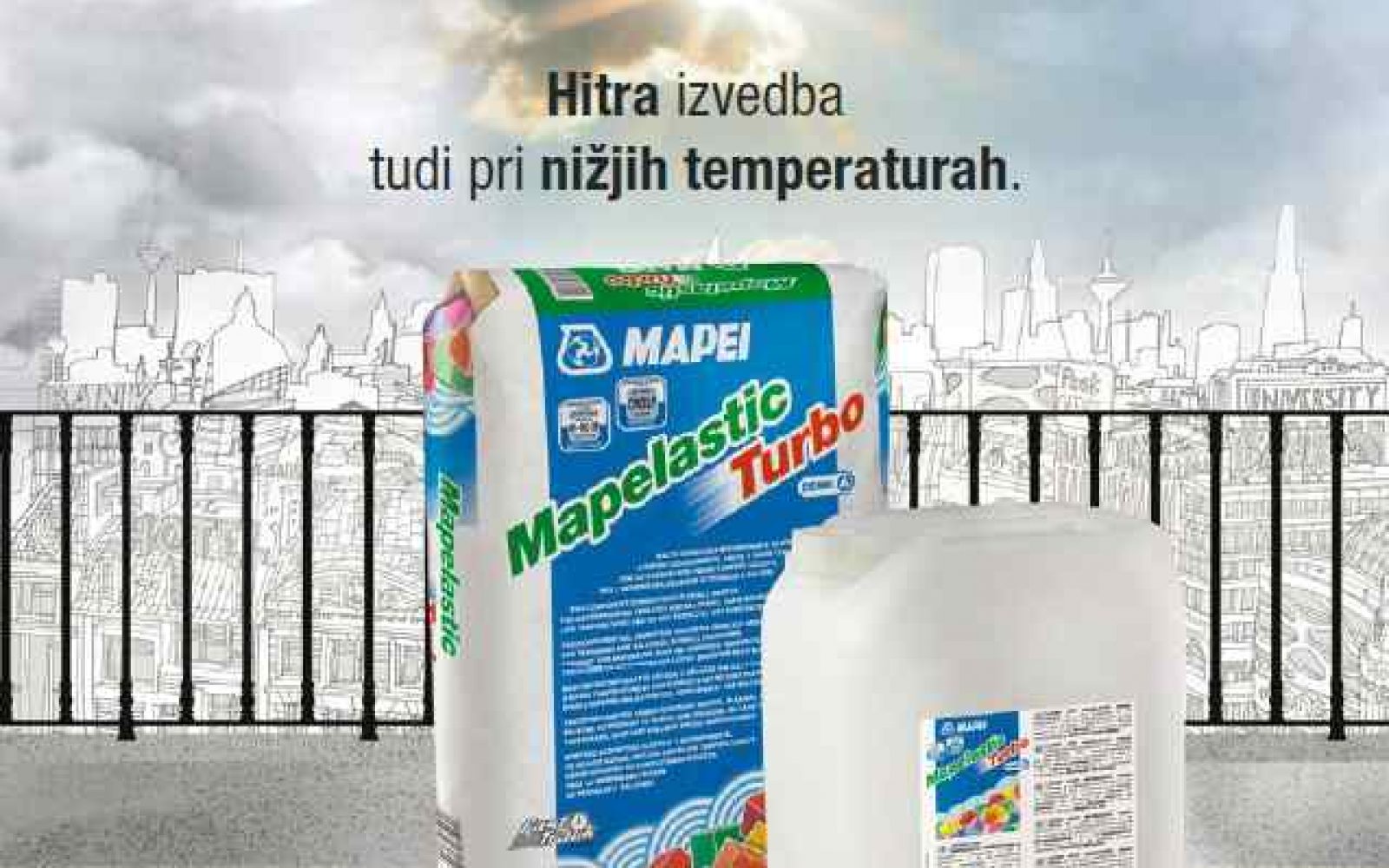 MAPELASTIC TURBO omogoča hitro izvedbo tudi pri nižjih temperaturah (do +5 ˚C), zato je še posebej primeren za uporabo v prihajajočih jesenskih dneh.