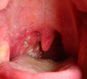 Če pogledamo bolniku v močno odprta usta, vidimo povečani, močno pordeli nebnici. Na nebnicah so lahko gnojni čepi ali pa so pokrite z belimi oblogami. Pordeli so tudi nebna loka, jeziček in mehko nebo, na katerem lahko vidimo tudi drobne pikčaste krvavitve. Jezik je v začetku bolezni ponavadi belo obložen, kasneje pa se lušči in zaradi povečanja brbončic dobi malinast videz. Običajno so povečane in močno boleče tudi področne bezgavke v kotu med spodnjo čeljustnico in vratom.