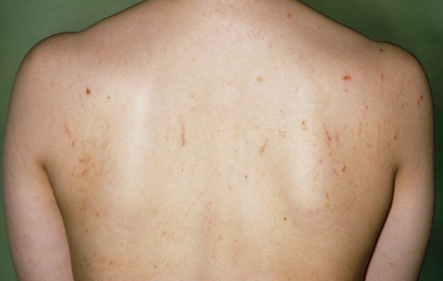 - Izpuščaj: lahko je droben, zrnat, kot koprivnica ali v obliki drobnih krvavitev v koži; razširi se po vsem telesu.