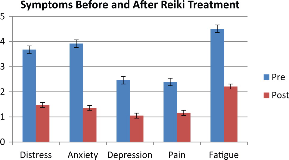 V Akademskem centru za medicinsko onkologijo, ZDA, so izvedli raziskavo vpliva reiki terapij pri bolnikih z rakom. V ocenjevalnem obdobju so opazili več kot 50-odstotno zmanjšanje stiske (s 3,80 na 1,55), anksioznosti (s 4,05 na 1,44), depresije (z 2,54 na 1,10), bolečine (od 2,58 do 1,21) in utrujenosti (od 4,80 do 2,30).