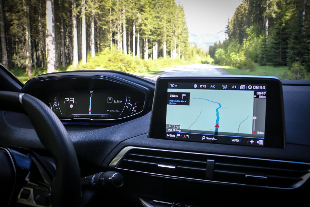 Sopotnik desno že odkriva mnoge možnosti, ki jih ponuja velik sredinski zaslon na dotik in kjer so na intuitiven način prikazana upravljalna stikala za udobje in navigacijo. Kam gremo danes? Pokljuka, Bled ali kar tako nekam po trenutnem navdihu oziroma cilju, ki nas je pritegnil na socialnih omrežjih? Ne mine sekunda, že se mi pred očmi izriše pot, izmeri razdalja ter izračuna čas prihoda. Ne, izgubili se z našim 5008 res ne bomo.
