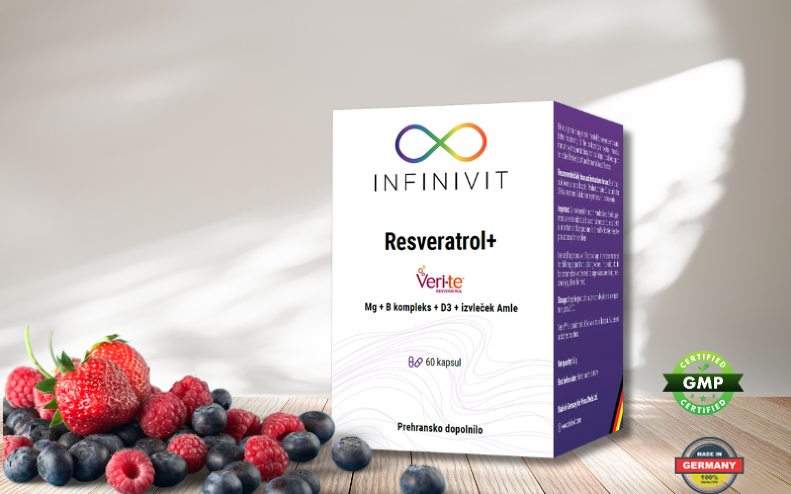 Infinivit Resveratrol+ je visoko kakovostno prehransko dopolnilo, ki vsebuje kar 300 mg trans- resveratrola izjemne čistosti in koncentracije. Poleg resveratrola vsebuje tudi vitamine C, D3 in B-kompleks ter dvojni magnezij, ki imajo vlogo pri delovanju imunskega sistema, ohranja zdravo srce in možgane, pripomore k manjši utrujenosti, delovanju mišic ter ščiti celice pred oksidativnim stresom.