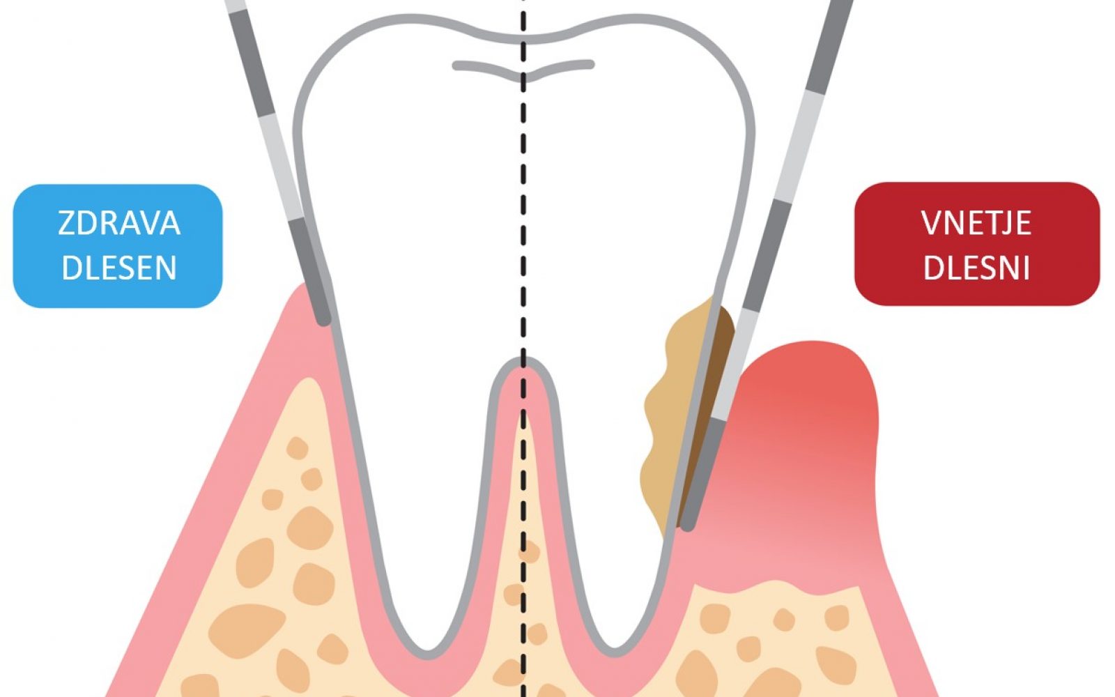Če ne skrbimo za ustno higieno, se v ustni votlini kopičijo mikrobi, ki so odgovorni za bolezenske spremembe. Običajno se razvijejo na težko dostopnih mestih, ki jih z uporabo zobne ščetke in drugih pripomočkov ne dosežemo, kot so rob dlesni, medzobni prostori, mesta pod mostički, zobnimi vsadki. Pojavi se krvavenje dlesni, ki postanejo nabrekle in rdeče. To prvo stopnjo vnetja imenujemo gingivitis. Če v tej fazi ne ukrepamo, lahko napreduje v parodontalno bolezen. Zanjo je značilen nastanek tako imenovanih parodontalnih žepkov in v najhujših primerih lahko pride do izgube zob.