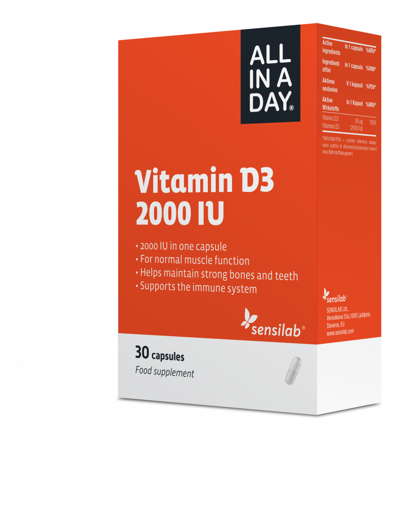 Med najboljšimi izdelki z aktivno obliko vitamina D – vitaminom D3 je ALL IN A DAY Vitamin D3 2000 IU. Zadostuje 1 kapsula na dan, s katero večina ljudi zagotovi zadostno preskrbljenost z vitaminom D3.