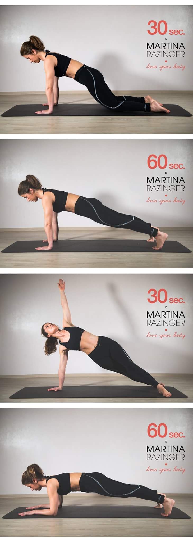 Meni ljuba in učinkovita vaja, ki jo skušam umestiti skoraj v vsak trening je deska ali »plank«. Odlična statična in dihalna vaja za celo telo, od ramen do meč. Na fotografiji vam predstavljam 4 različne deske s časovno različico. Lahko jih kombinirate v drugačnem zaporedju in drugačni časovni različici. Za čiste začetnike predlagam, da desko držite 20 sekund in potem v enem tednu stopnjujete na 30 sekund. Nato vsakemu tednu dodajte novih 20 sekund.