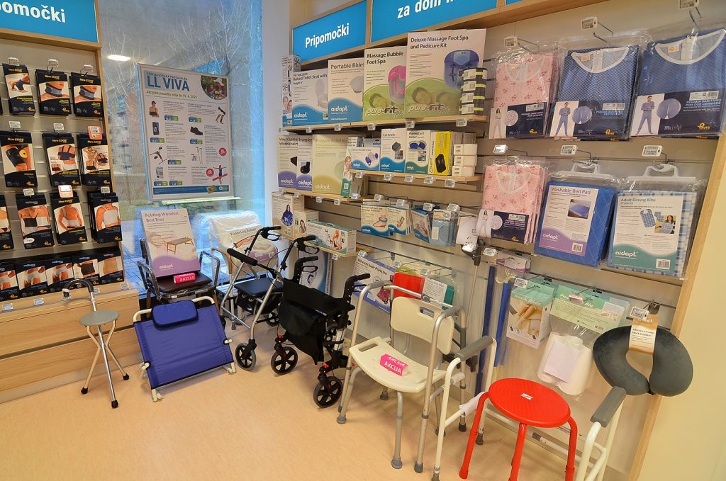 Strankam so na voljo pripomočki za pomoč starejšim pri vsakdanjih opravilih, pripomočki za gibalno ovirane osebe, ortopedska obutev, opornice, diagnostični aparati, izdelki za oskrbo poškodb in ran, kozmetični izdelki, otroški program, živila za posebne prehranske in zdravstvene namene, izdelki za odpravljanje oziroma lajšanje težav, povezanih z boleznimi sodobnega časa, in številni drugi izdelki.