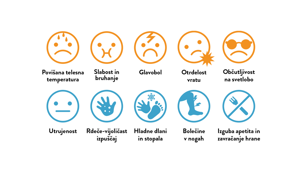 - Prvi simptomi so glavobol, povišana telesna temperatura, izguba apetita, slabost in bruhanje.