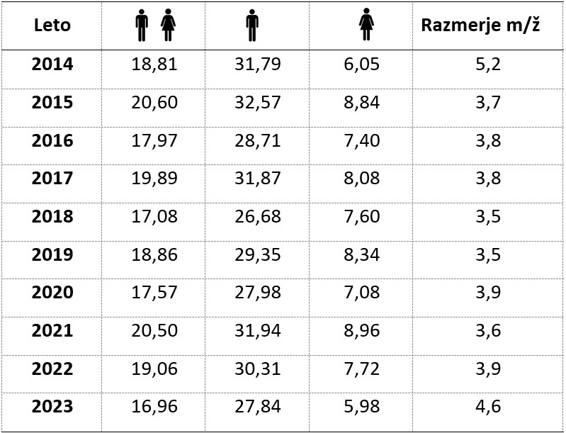 Stopnja samomorov med moškimi je v svetu dva do štirikrat večja kot pri ženskah. Moški v Sloveniji so samomor storili celo 4,6-krat pogosteje kot ženske. V Sloveniji je leta 2023 naredilo samomor 388 ljudi, od tega 325 moških in 63 žensk.