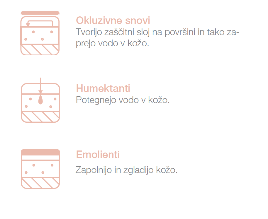• pomembno je, da preprečiti uhajanje vlage iz kože z uporabo okulzivov, npr. z uporabo olja in masla, saj dejansko ustvarjajo zaščitno plast na koži, ki podpira pregrado kože.
