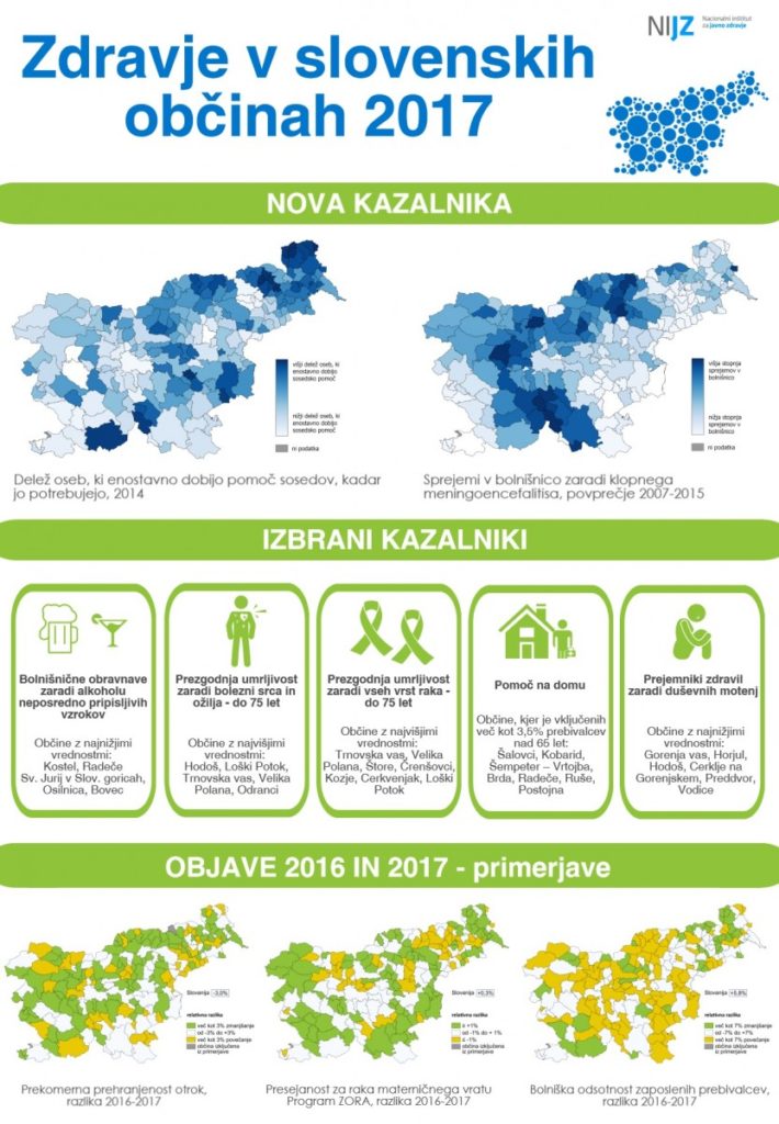 V letošnji objavi Nacionalni inštitut za javno zdravje (NIJZ) prikazuje novejše podatke o zdravstvenem stanju prebivalstva v slovenskih občinah in primerjavo med njimi. Kazalniki o zdravju v slovenskih občinah so objavljeni na spletnem naslovu obcine.nijz.si v zavihku 2017.