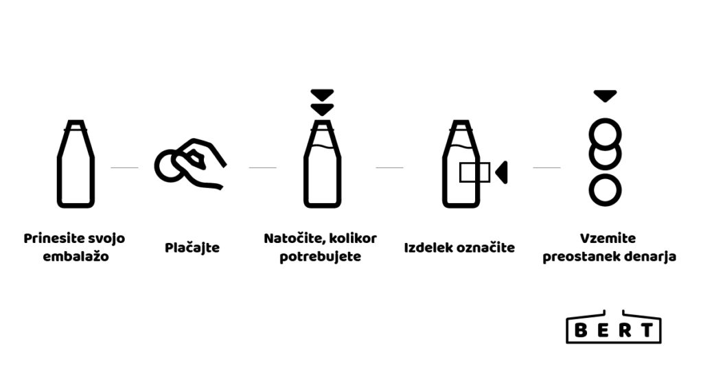 V Bertu so kupcem na voljo izdelki, ki so narejeni lokalno in po trajnostnih merilih, so kakovostni ter naprodaj po konkurenčnih cenah. Celotna oprema brezembalažne trgovine je narejena iz odpadne plastične embalaže, ki jo stopijo in predelajo v plastične plošče, iz katerih nastane pohištvo.
