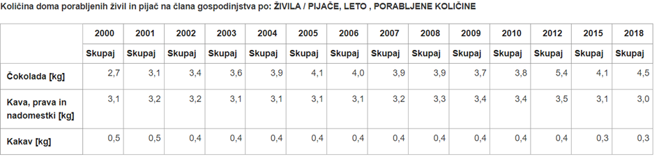 Kava, na drugi strani, ostaja stalnica v slovenskih gospodinjstvih. Njena poraba je skozi leta ostala skoraj nespremenjena. Leta 2000 je povprečen Slovenec porabil 3,1 kilograma kave in kavnih nadomestkov, do leta 2018 pa se je številka ustavila pri ravno treh kilogramih. Kljub rahlim nihanjem kava ohranja svoje mesto v vsakodnevnih navadah Slovencev, medtem ko čokolada postaja vse večji sladki užitek.