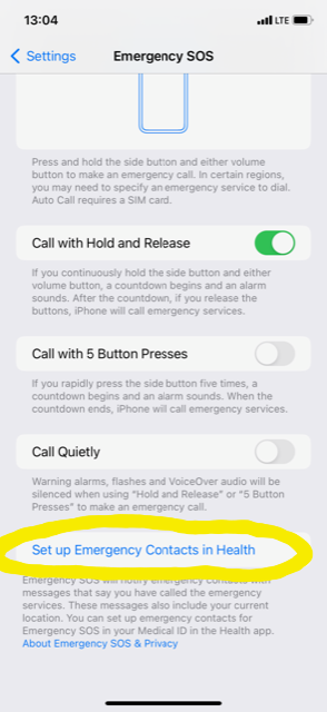 V Emergency SOS se pomaknemo nižje, do napisa “Set up Emergency Contacts in Health”