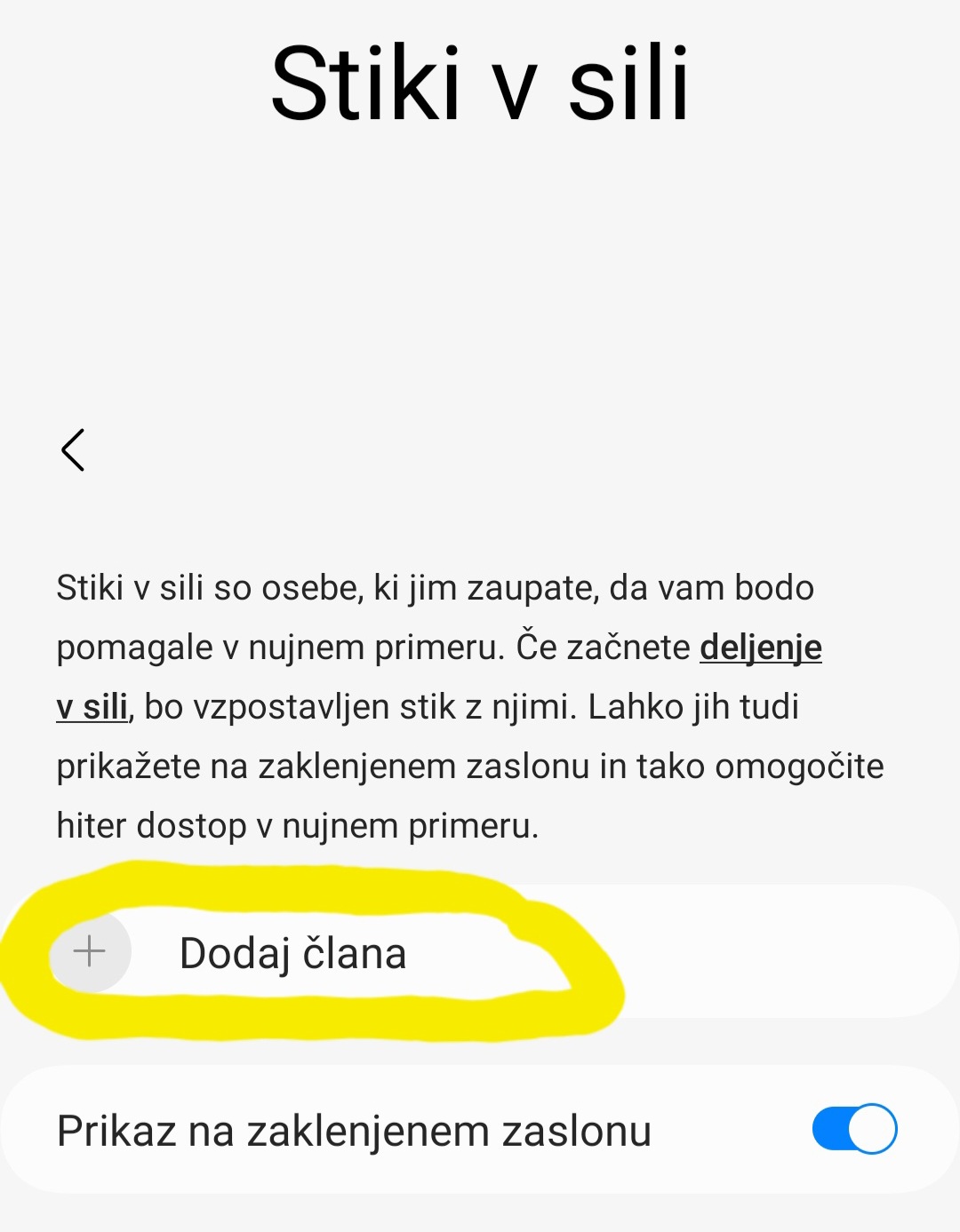 Dodajanja kontaktov kot “Stik v sili” se uredi v splošnih nastavitvah: