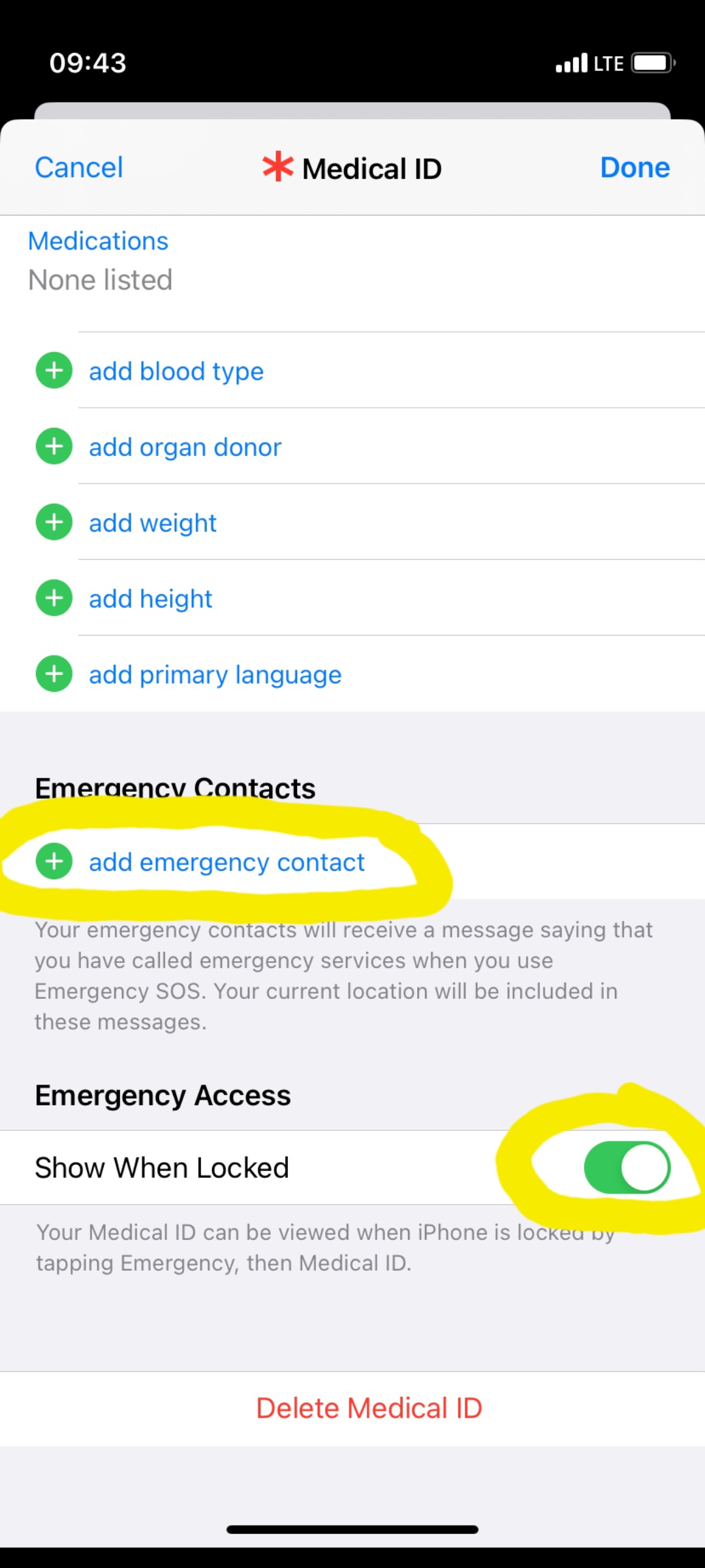 Odpre se več možnosti urejanja; pomaknjemo se nižje in izberemo “add emergency contact” ter ne pozabimo vklopiti “Show When Locked”