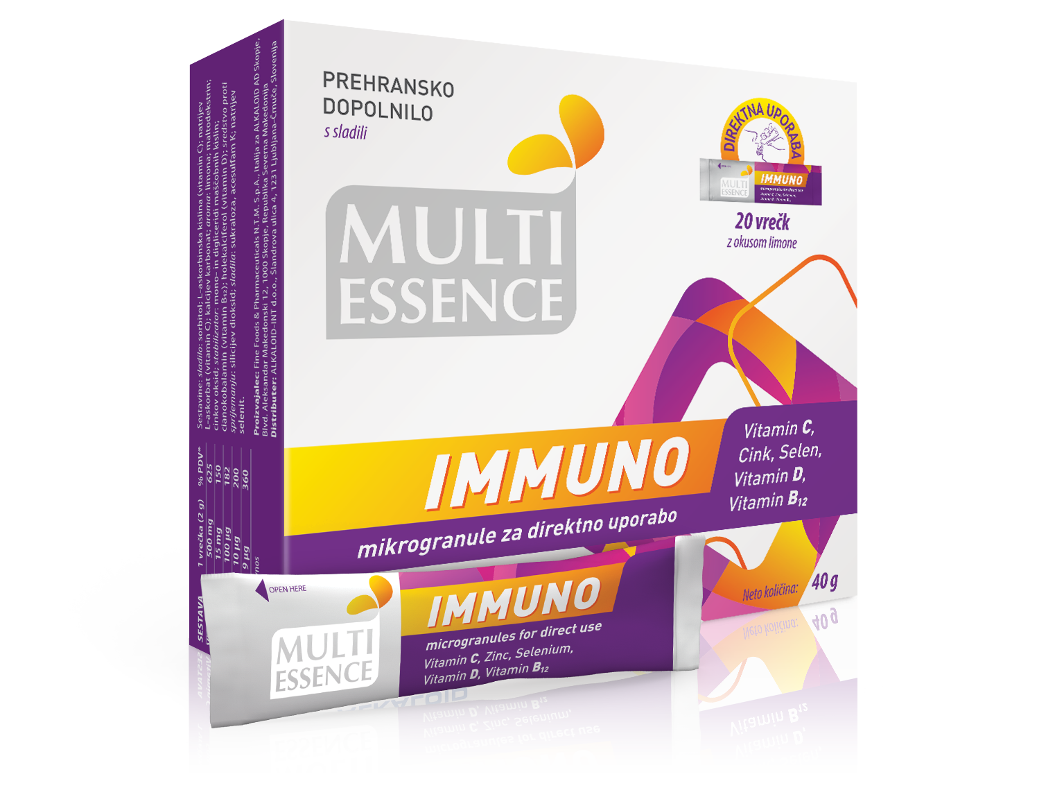 MULTI ESSENCE IMMUNO je prehransko dopolnilo v vrečkah za direktno uporabo z okusom limone. Mikrogranule za direktno uporabo prehranskega dopolnila MULTI ESSENCE IMMUNO zagotavljajo potrebno količino vitaminov in mineralov za pokritje povečanih potreb organizma.
