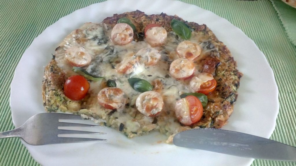 Za testo naribamo bučko, jo posolimo in pustimo stati, da spusti vodo. Nato jo ožamemo, dodamo ostale sestavine za testo in na peki papirju oblikujemo pizzo. Pečemo na 200 stopinj približno 15 min, oziroma tako dolgo, da se zapeče. Vzamemo iz pečice, obložimo po želji, vrnemo v pečico, da se sir po vrhu raztopi. Potresemo s svežo baziliko in serviramo.