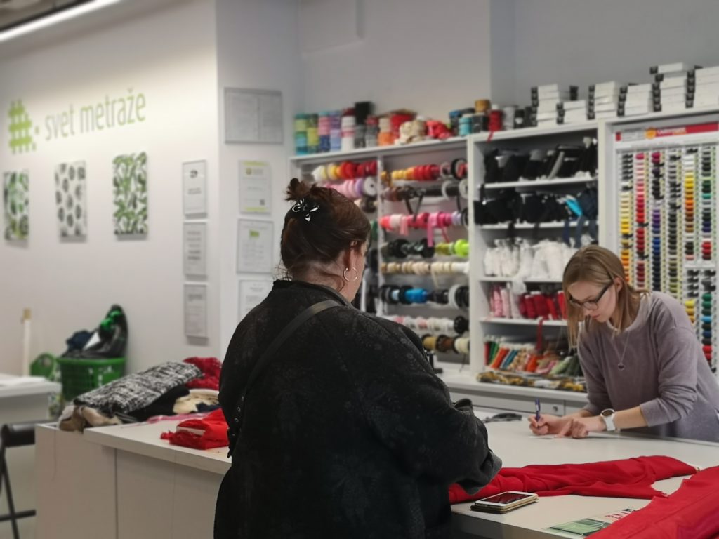 Po blago smo tudi letos odšli v specializirano trgovino za vse, ki radi šivajo – Svet Metraže. Tukaj najdemo široko izbiro blaga, podlog, trakov, kristalčkov, prejic, volne, umetnega krzna, tapetniškega blaga, sukancev in vsega, kar šivilje potrebujejo. Vedno lahko svoje želje prilagodiš ponudbi. Babica se je takoj lotila dela in s pomočjo profesionalnega, ustrežljivega in nasmejanega osebja našla pravo blago in okraske za pustni kostum.