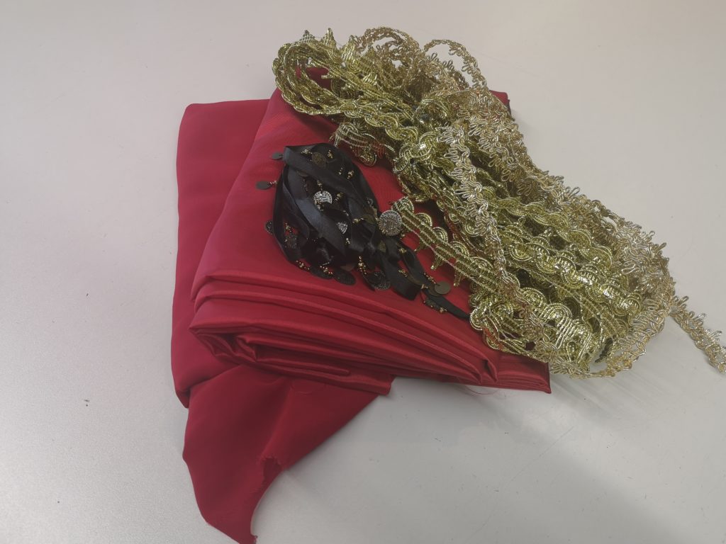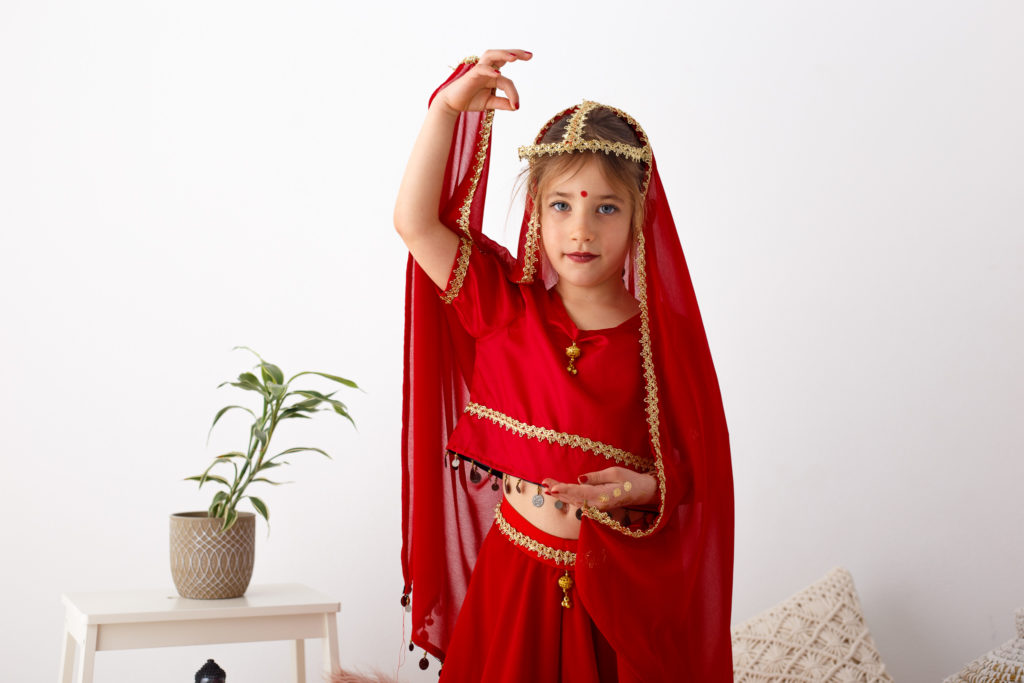 Šivanje je babičin hobi, a ji vseeno vedno uspe poustvariti Ninino zamisel. Saj veste – šivilja mora upoštevati naročnikove želje in zamisli! Nina je na spletu poiskala sliko pustnega kostuma indijske princese in jo pokazala babici, ki je zadevo še nadgradila in iz viskozne podloge ter šifona sešila čudovito, dvojno, dolgo krilo, kratek top in naglavno vlečko s tikko, ki jo je pritrdila na obroč za lase. Krilo in vlečka sta obrobljena z okrasnimi, zlatimi trakovi, vlečka ima dodane žvenketajoče cekinčke, ki so nanizani na okrasni trak. Za piko na i je vlečki dodala še naprstni zanki (dedova ideja – tako da veste, da je sodelovala cela družina), da jo bo lahko Nina upravljala z rokami in tako še dodatno poudarila svoj kostum. Končni izdelek je krasen kostum – dolgo, široko (ko se vrtiš, mora iti v zrak), dvojno krilo, tikka z rahlo prosojno vlečko, ki omogoča zakrite in skrivnostne poglede in kratek top, ki kaže ravno pravšen del trupa, da Nina lahko nastopa kot trebušna plesalka.