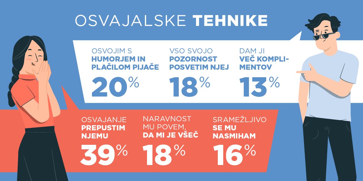 Kako osvojiti žensko? 20% moških pravi, da je pravi recept naslednji: čimvečkrat jo poskušaj nasmejati, vse to pa spelji ob pijači, ki ji jo tudi plačaj. Seveda ne pozabi vse svoje pozornosti posvetiti njej (18% vprašanih meni, da je osredotočena pozornost prav tako pomembna za uspeh).