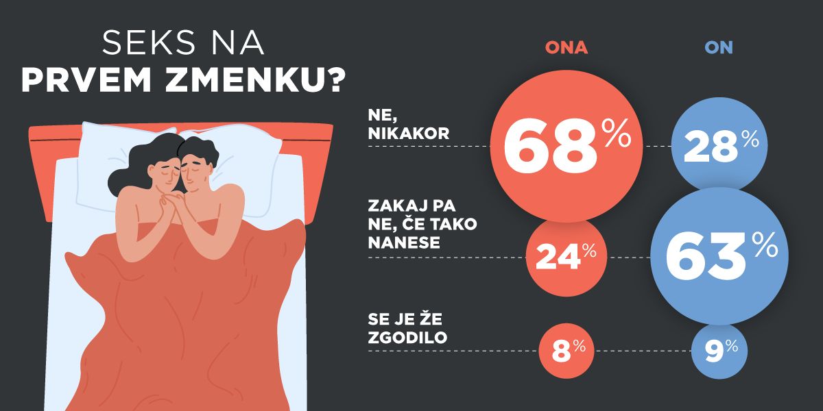 Da moški in ženske na seks gledajo drugače, je znano že od nekaj. Seks na prvem zmenku je za 68% žensk absolutni ne, medtem ko so fantje temu malce bolj naklonjeni – 63% moških namreč seksu na prvem zmenku pravi: “Zakaj pa ne, če tako nanese”.