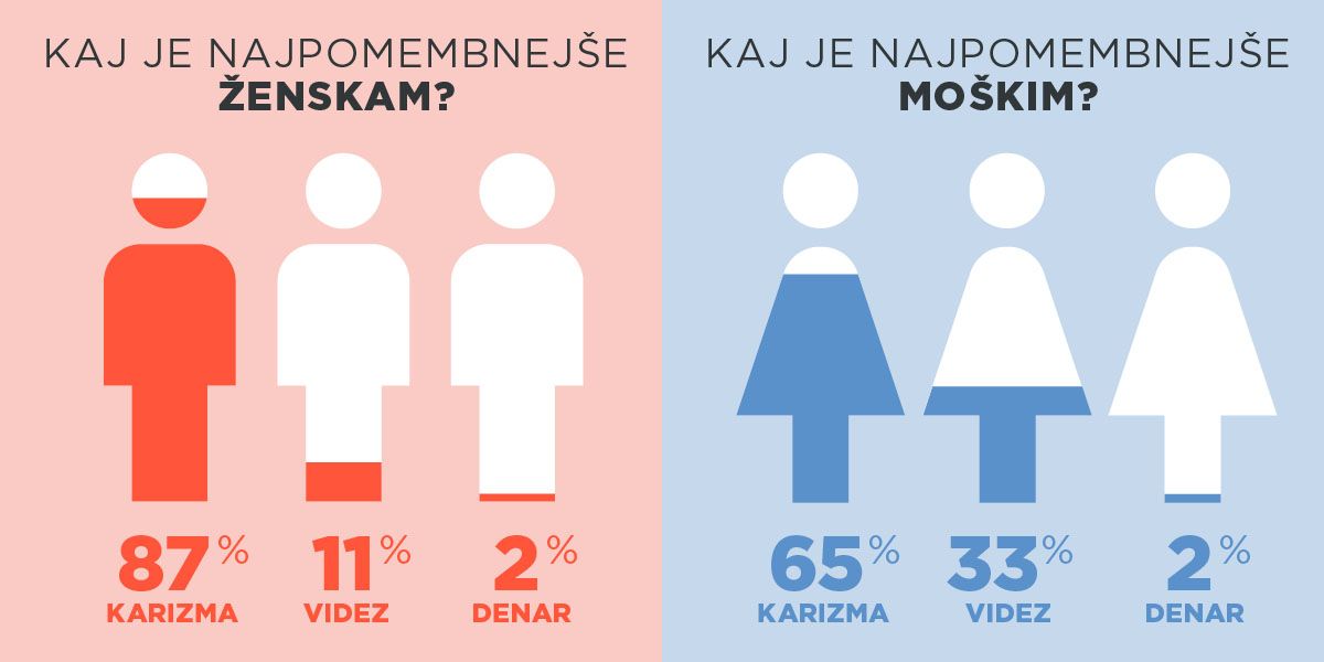 74% žensk in 70% moških meni, da je videz definitivno odločilen faktor, ali bo prišlo do zmenka, ampak najpomembnejša lastnost, ki pri nasprotnem spolu res pritegne, pa je karizma – tako pravi 87% žensk in 65% moških.