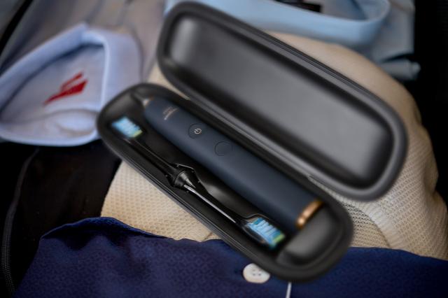 V kompletu poleg držala dobite tudi štiri pametne glave, lično stojalo, kamor po uporabi te lahko tudi pospravite, polnilni kozarec ter lično potovalno USB torbico, ki omogoča polnjenje tudi, ko niste doma.