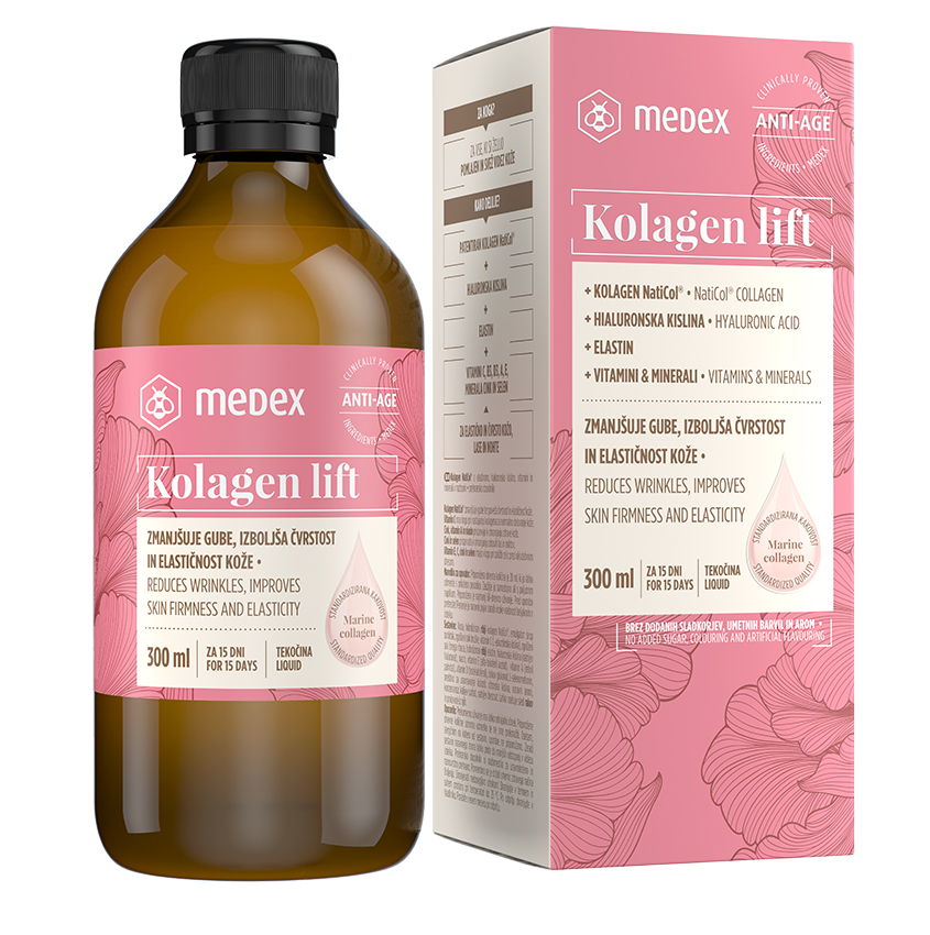 Kolagen lift v tekočini vsebuje patentiran hidroliziran kolagen, ki je ribjega izvora, z dodatkom elastina, hialuronske kisline, vitaminov in mineralov. ”Dokazano zmanjšuje gube, izboljša čvrstost in elastičnost kože ter ohranja zdrave lase in nohte. Z rednim uživanjem boste svojo kožo podprli prek notranjosti in ji vrnili, kar ji narava s časom odvzema,” pravijo v Medexu in dodajajo, da že pripravljen napitek lahko uživamo samostojno, brez raztapljanja v vodi ali mešanja v sokove in jogurte, da bi zakrili njegov specifičen okus. Kolagen lift v tekočini je blagega sadnega okusa. Kombinacije hruške in črnega ribeza ter naravne arome malin se bomo enostavno navadili.