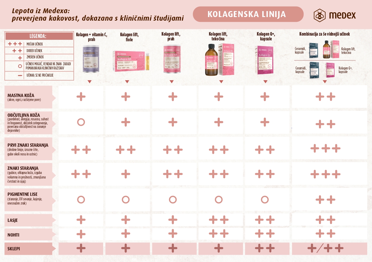 Kolagen je tista beljakovina, ki je najbolj zastopana v človeškem telesu in sodi med strukturne proteine s funkcijo dajanja opore in oblike. Prav tako je zelo pomemben gradnik sklepnega hrustanca, kože, nohtov in las, katerega produkcija v telesu začne upadati že kmalu po 20. letu starosti. Koža zato z vsakim letom izgubi nekaj čvrstosti in elastičnosti, postaja suha in začnejo se tvoriti gubice. Da bi upočasnili te procese, strokovnjaki iz Medexa svetujejo uporabo kolagena v tekoči obliki.