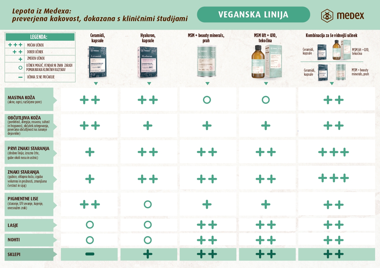 Če ste vsaj dvakrat odgovorili z DA, potem imate rešitev na dlani. V podjetju Medex, kjer so že več kot 65 let zavezani inovacijam, tradiciji, kakovosti ter varnosti izdelkov, se po novem ponašajo z vegansko formulo uspeha, ki navdušuje tudi slovenske vplivnice. MSM lift + Q10 je raztopina, pripravljena iz organskega vira žvepla (metil sulfonil metan). Je tretji najpogostejši mineral v človeškem telesu, ki pa ga s prehrano pogosto ne zaužijemo dovolj. Formulo dopolnjujejo drugi ključni minerali lepote – selen, cink in baker – dnevni učinek pa bo učinkovito zmanjšal gube ter povečeval čvrstost in elastičnost kože.
