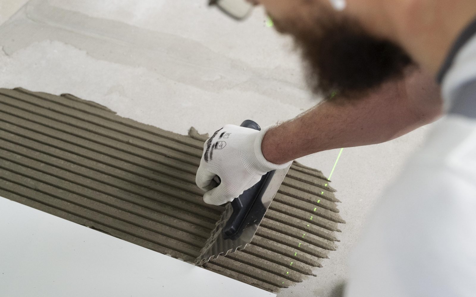 Položimo npr. oblogo iz keramičnih ploščic v hitro-vezoče cementno lepilo razreda C2FT v skladu s standardom SIST EN 12004, kot je ADESILEX P9 EXPRESS. Pri polaganju spoštujemo raster v estrihu izvedenih dilatacijskih reg.