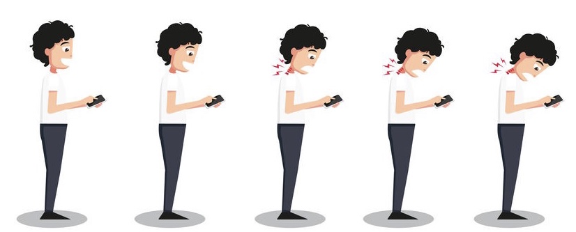 Uporaba telefona narašča pri vseh starostnih skupinah, najbolj ogroženi so najstniki. Pri »brskanju« po telefonu je lahko naklon glave spuščen tudi do 60 stopinj! Najpogosteje držimo telefon v rokah v višini pasu, glava in vrat pa sta upognjena naprej, kar močno vpliva na okvaro hrbtenice in medvretenčnih ploščic.