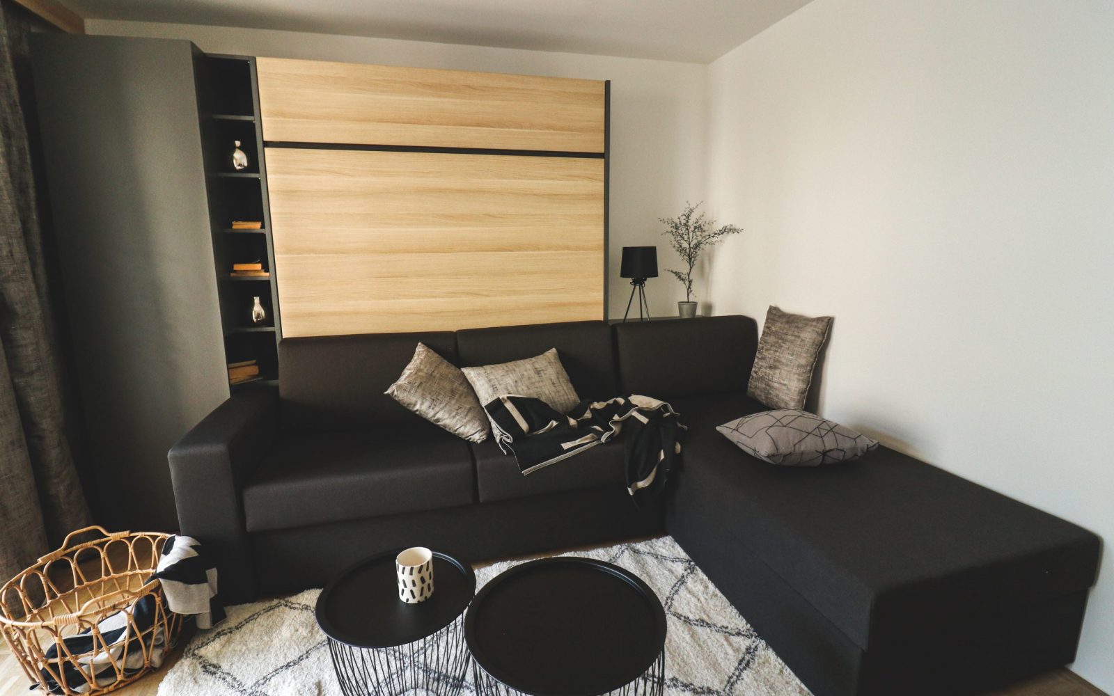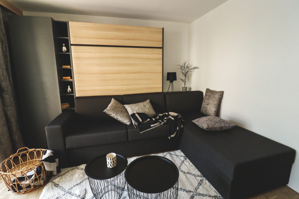 Verjetno največji hit med našimi strankami že nekaj let, pa predstavlja kombinacija omarne postelje s sedežno garnituro, pri čemer lahko sistem nadgradite s knjižnimi policami ali pa z garderobnimi omarami. Sami lahko izberete  dekorje tako lesne kot barvne , kakor tudi tkanino za sedežno garnituro, ki se tako popolnoma sklada z barvo vašega prostora (če ste drzni, pa ga lahko s kakšno bolj nevsakdanjo tudi popestrite). Kupec ima na voljo izbiro dvoseda z nasloni (ali brez), lahko pa se odloči za kotno izvedbo, pri katerem je možnost dodatnega predala za shranjevanje, ki vam pri prostorski stiski zagotovo pride še kako prav. Posteljo pri tem sistemu je zelo preprosto raztegniti in pospraviti, pri čemer pa ni treba umikati blazin na sedežni garnituri, saj se zloži sama vase. Kljub temu smo poskrbeli, da je ležišče vedno primerno zračeno.