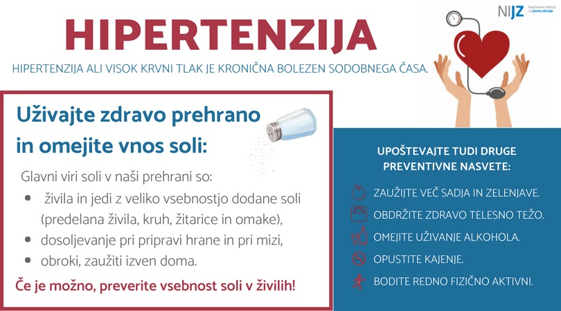 Prekomeren vnos soli in s tem natrija je dokazan neposredni prehranski dejavnik tveganja za povišan krvni tlak, ta pa predstavlja pomemben vzrok za nastanek možganske kapi ter drugih bolezni srca in ožilja. Prevelika količina zaužite soli je dejavnik tveganja za nastanek drugih kroničnih bolezni (bolezni ledvic, sladkorne bolezni tipa 2, osteoporoze, debelosti in raka želodca). Za odrasle je varen dnevni vnos soli do 5 gramov (ena majhna čajna žičk), vključno z zaužito soljo v živilih/obrokih. Glavni viri soli v naši prehrani so živila in jedi z veliko vsebnostjo dodane soli (kruh, suhomesnati izdelki, konzervirana hrana), dosoljevanje pri pripravi hrane in pri mizi ter obroki, zaužiti izven doma. Prvi uspehi desetletnega akcijskega načrta za zmanjševanje vnosa soli pri prebivalcih Slovenije (2010 – 2020) so se že pokazali, saj se je vnos soli pri prebivalcih Slovenije zmanjšal za približno 10 %. Akcijski načrt je, kot prvi na področju preoblikovanja živil, nastal na podlagi nacionalnih raziskav in je prilagojen značilnostim naše države in njenih prebivalcev ter zato uspešen in predstavljen kot primer dobre prakse tudi v svetovnem merilu.