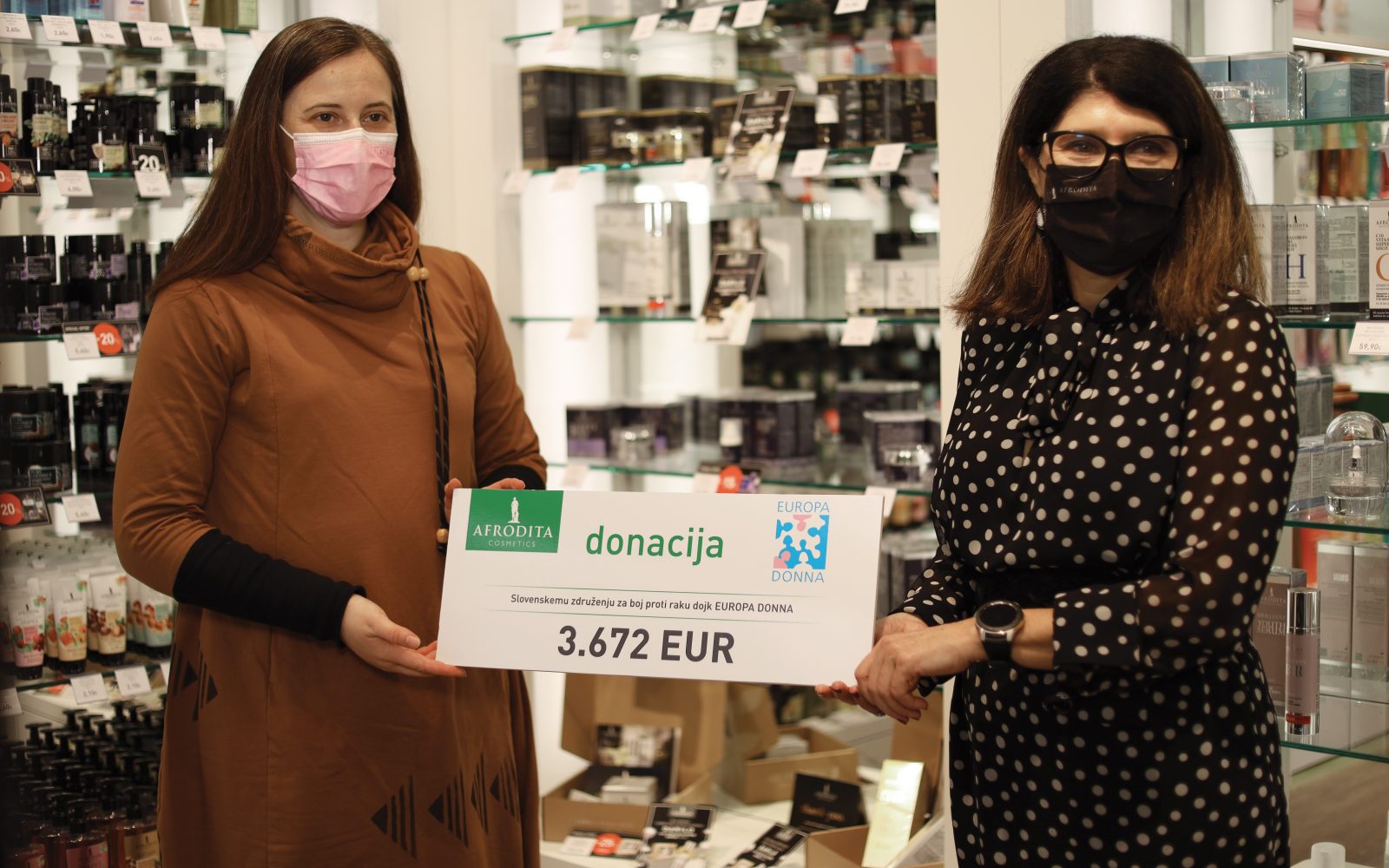 Ob koncu aktivnosti so bili pri Afroditi veseli zbranega zneska v višini 1.836 evrov, ki je ponovno potrdil, da je srčnost prisotna v zavesti ljudi. Zato so se odločili, da se vsem darovalcem zahvalijo tako, da zbrani znesek podvojijo z lastno donacijo. V lepotnem centru in trgovini na Kongresnem trgu v Ljubljani so sprejeli predsednico združenja Tanjo Španič (na fotografiji levo), ki je v imenu združenja prejela donacijo v višini 3.672 evrov.