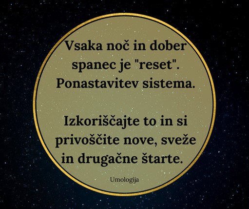 Eno je torej, da spremljamo in upoštevamo znake in sporočila svojega telesa. Postanimo dojemljivi za utrujenost in zaspanost, ki nam jo sporoča. To zna sporočati vsako telo, ne znamo pa vsi tega uporabljati sebi v korist. Tako smo ob večerih prepričani, da smo dobri in pridni, ker smo se že tretjič prepričali, da moramo narediti ali pogledati »samo še tole«, preden gremo spat. Naša prepričanja so tako zmotno vezana na dejavnosti, ki naj bi nam koristile. Mislite, da ste veliko pridobili, ker vam je uspelo še nekaj vriniti na urnik? Da ste v prednosti, ker ste še nekaj »na hitro« prebrali, pogledali, prebrskali on-line, postorili, popravili, napisali …? Predvsem ste morda pridobili energetsko izgubo, še en delček težko nadomestljive regeneracije.