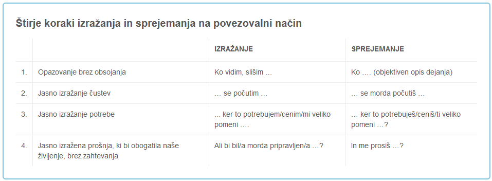 “Prvi korak v učenju nenasilne komunikacije je razlikovanje med povezovalnim in razdiralnim jezikom. V razdiralnem jeziku se postavljajo zahteve, v povezovalnem jeziku pa prošnje. Cilj je naučiti se, kako se izražati in poslušati v povezovalnem jeziku. Razdiralni jezik v procesu izražanja vključuje sodbe, interpretacije, nalepke …, v procesu poslušanja pa nasvete, pomilovanje, povezovanje s svojo zgodbo …” opisuje sogovornica.