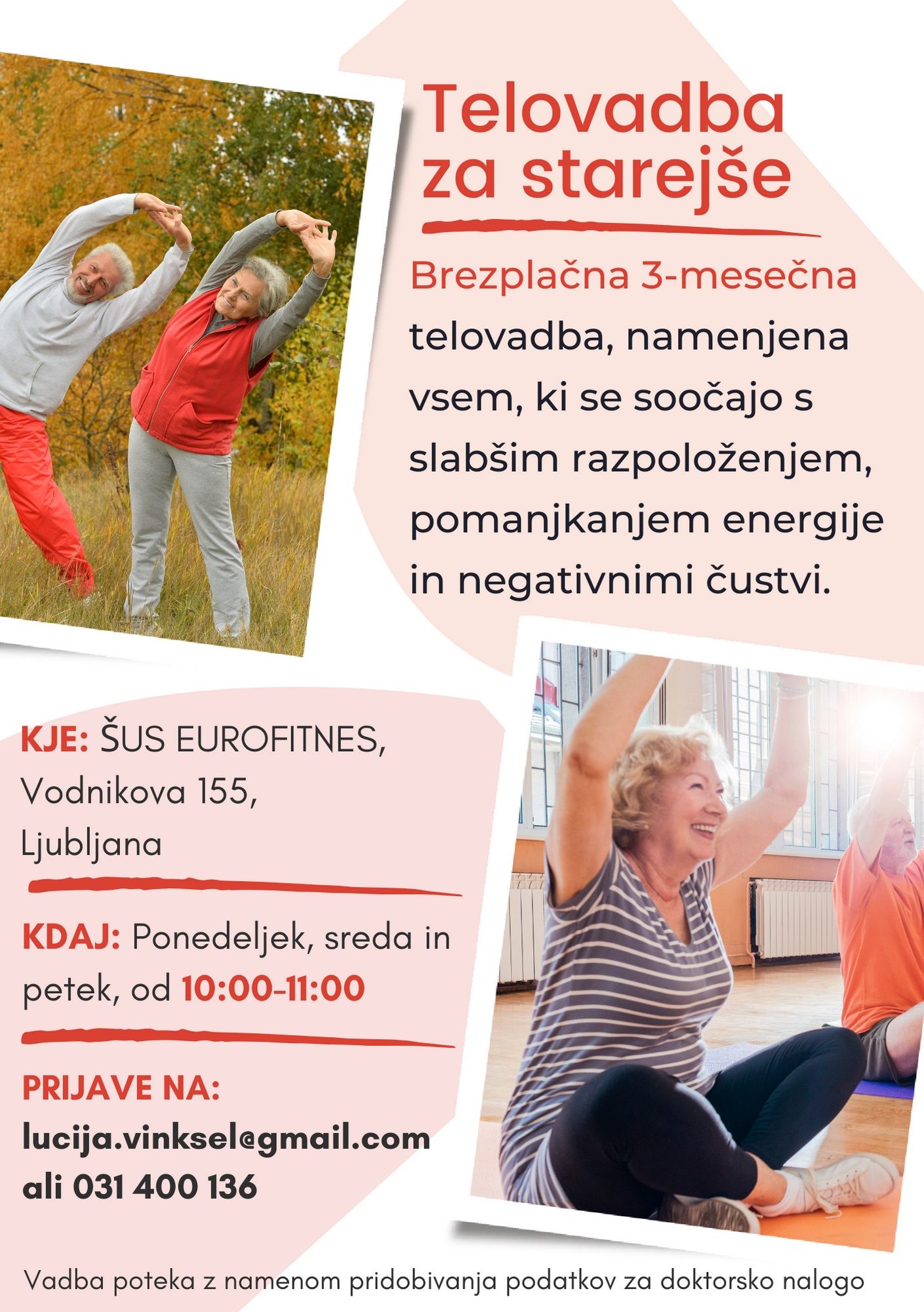 S tem, boste pomagali sebi na poti do boljšega počutja in pripomogli k dopolnitvi še neznanih vprašanj v povezavi s telesno dejavnostjo in depresijo. Več o možnosti vključitve v brezplačno vadbo, ki se bo predvidoma začela januarja, je v vabilu na koncu članka.